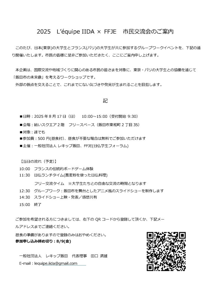 2025年8月5日 / 最終更新日時 : 2025年8月6日 adminlequipe エコール・デテ エコール・デテ IIDA 2025市民交流会のご案内 ◆参加申込みフォームはこちらから 市民交流会のご案内0801ダウンロード FacebookXBluesky