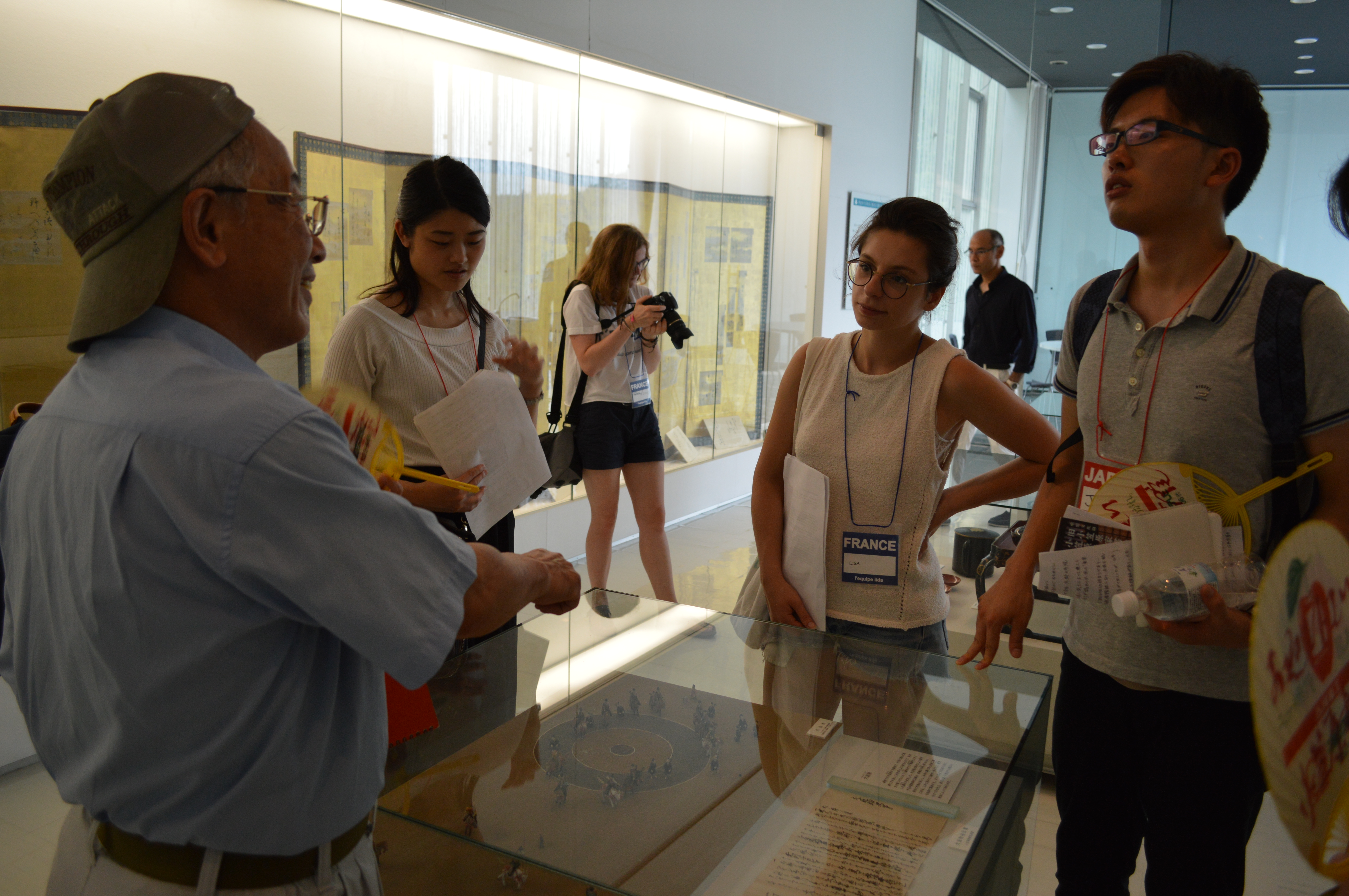 その後1964年まで小笠原氏が住んでいましたが、飯田市が買い取り現在に至ります。1952年国の重要文化財に指定されました。江戸時代初めに造られた武家書院、旗本の居館が残っている唯一の建物です。なかなか日本オリジナルの固有名詞が多く、翻訳しにくいところもあったかと思われますが、FFJEの清水君がフランス語で皆に伝えてくれました(着帽で後ろ向きなのが塩澤さんです)。