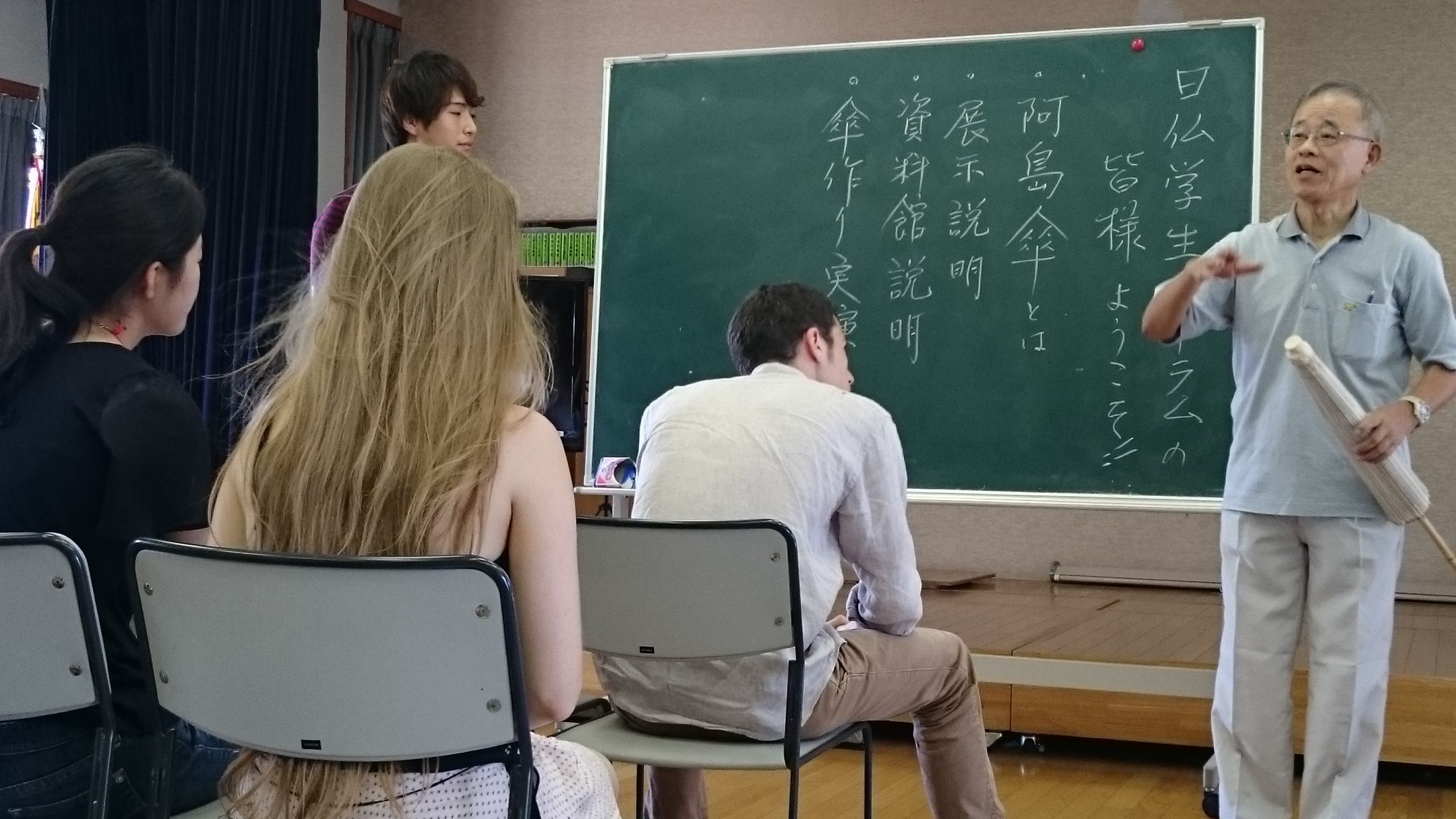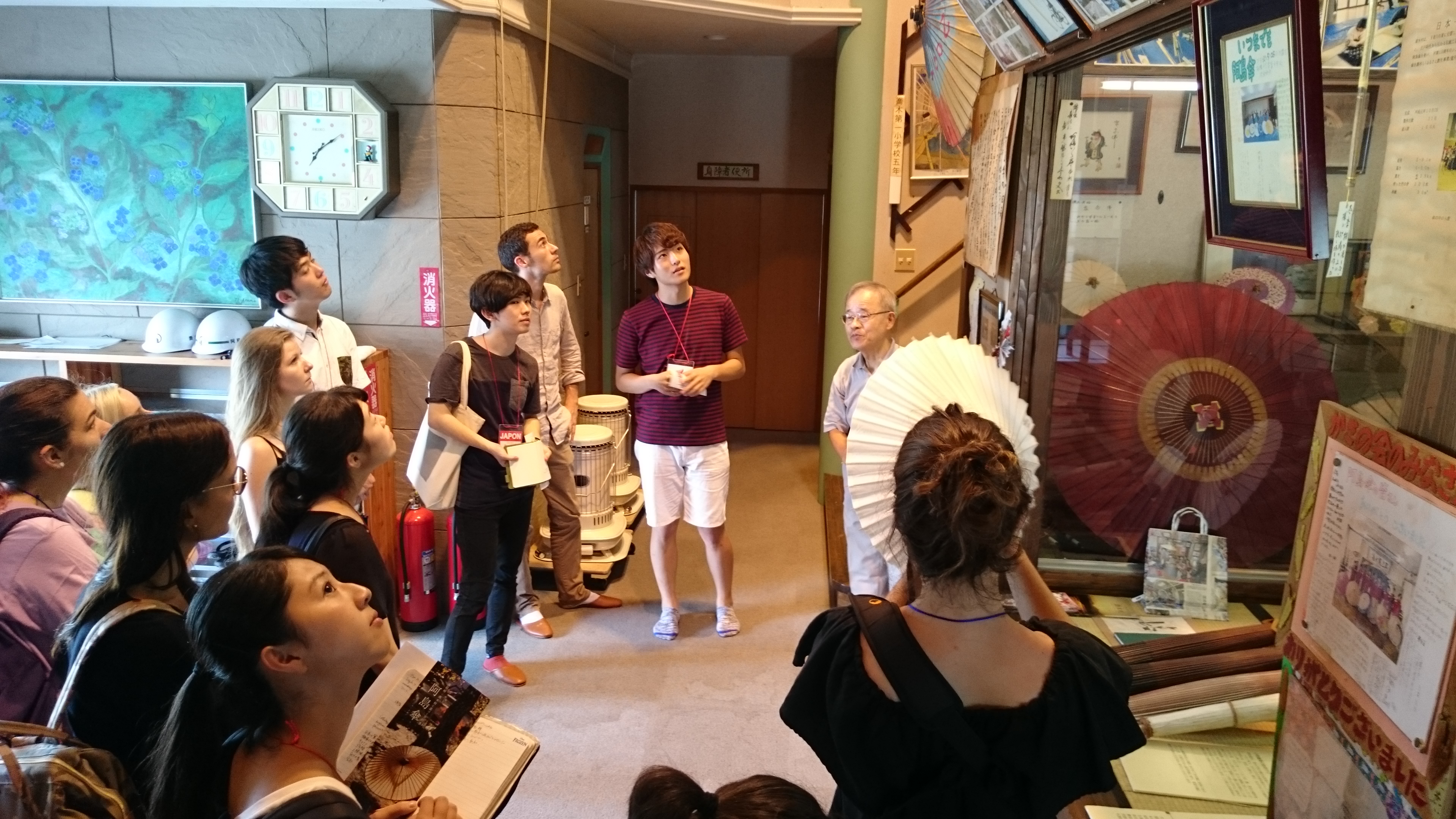空調のないさほど広くない部屋に大勢で入り、このときの気温が37℃であったため、学生たちは一様に真っ赤な顔をして大粒の汗を汗を流しながら説明を聞いていました。このとき目の前にいたフランス人学生に顔の前で手をぱたぱたとさせて暑いねというようなジェスチャーをしたら、もうたまらないといった様子で天を仰いで白目を剥いて返事をしていました。説明の内容は頭に入ったのでしょうか。