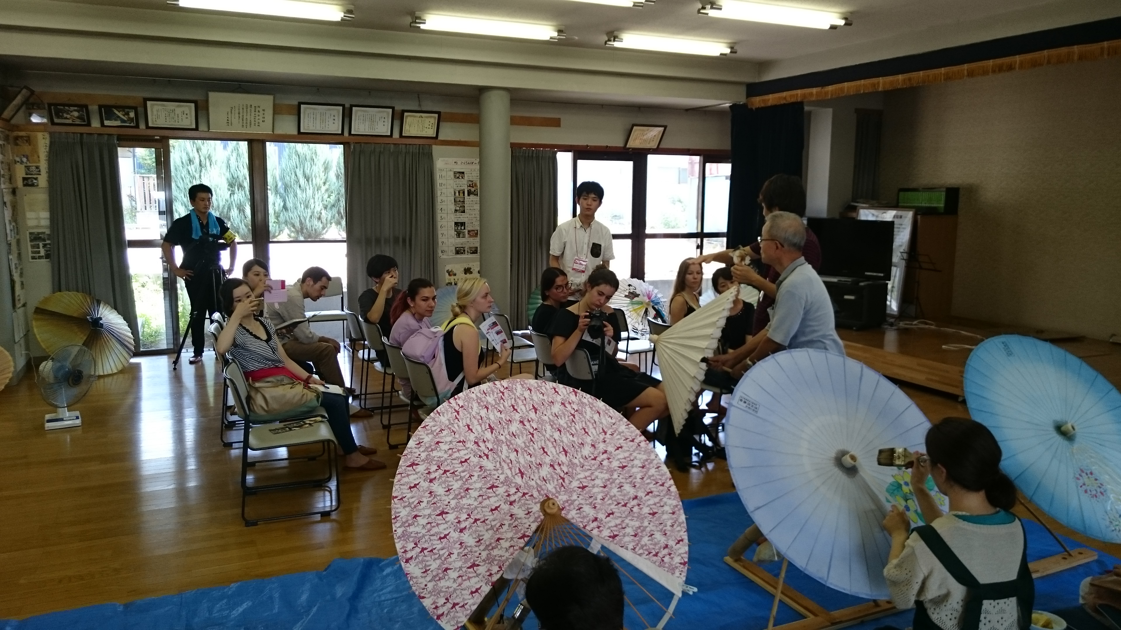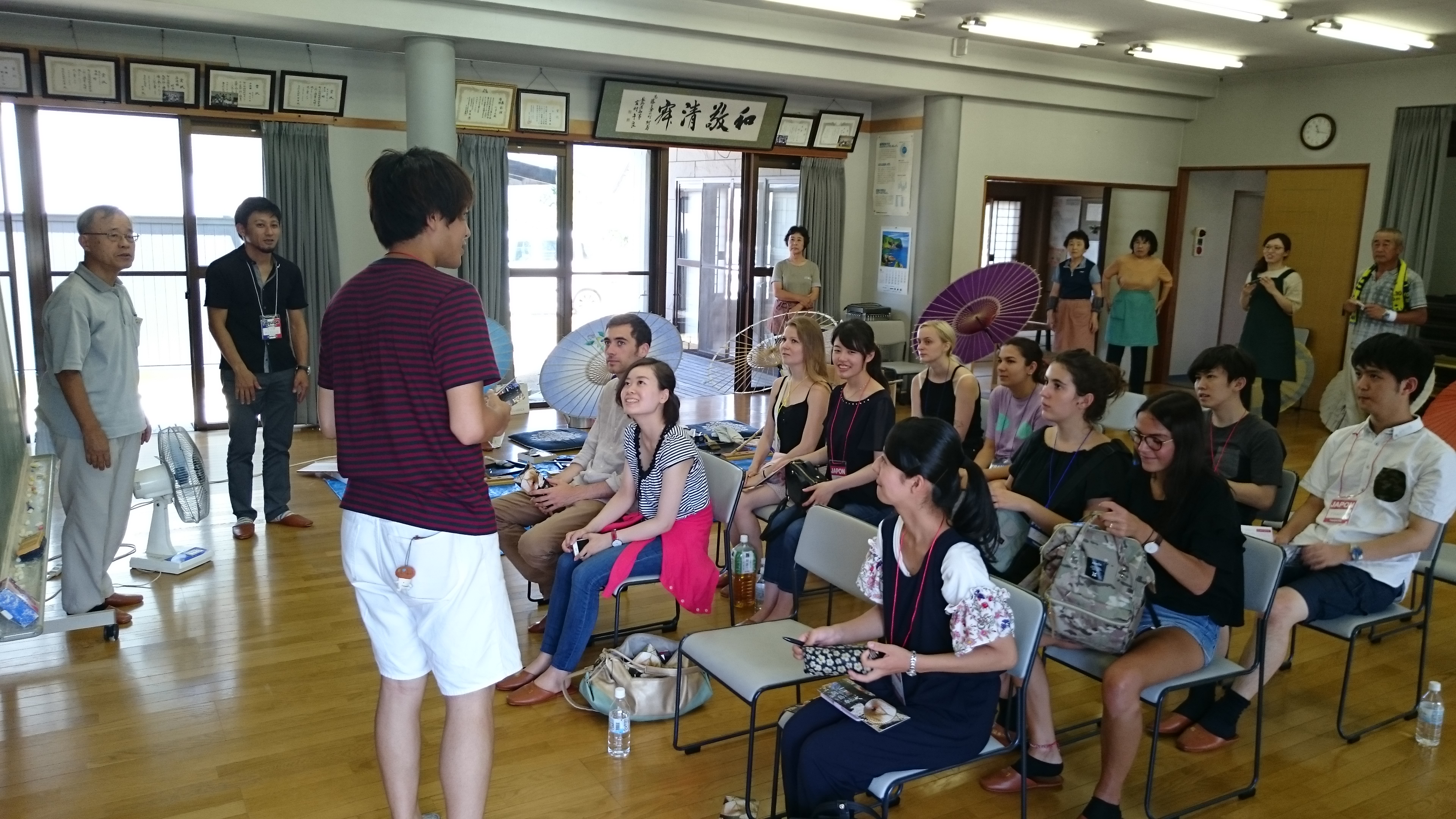 阿島傘とは何か、その説明として歴史や特徴について説明をして頂きました。久保田会長は校長先生をされていた方だからなのか、ゆっくりと落ち着いた話し方をされていて、英語通訳に入ったFFJEの森谷君もやりやすかったように見受けられました。
