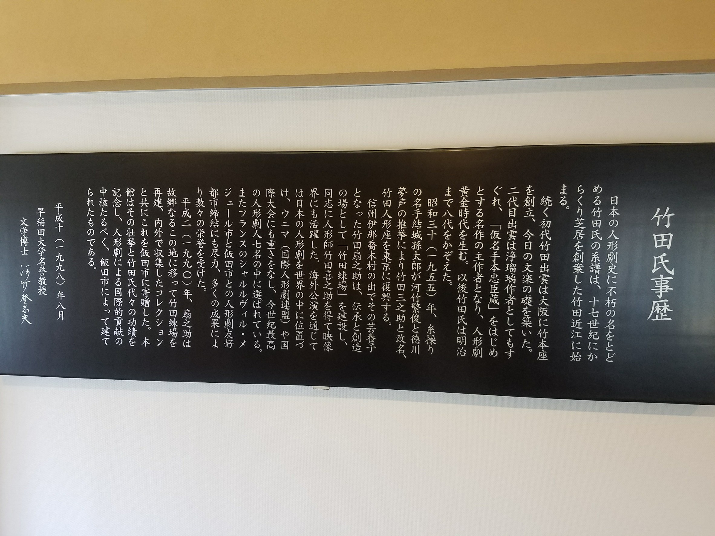 人形操作体験の後は、館内に収蔵されている人形などの展示を見て回りました。先ほど水上氏に解説を頂いた部屋の入口に竹田氏事歴があり、ここに飯田市とシャルルヴィル・メジエール市とが友好都市となる経緯が表示されていました。ここに書かれていることがあり、我々の活動を通じてフランス人学生たちが飯田に来て、そしていまこの人形館にいるということが運命であるかのように感じられました。